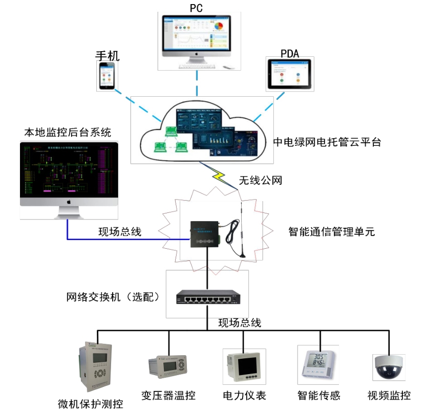 1. 【采集站內智能設備信息】—— 通過 485 串口總線或以太網通信等方式與站內的智能設備(微機保護裝置、電力儀表、測控裝置、站內模擬盤、直流屏、主變溫控裝置等)進行通信,接收處理并轉發智能設備上送的各種信息。